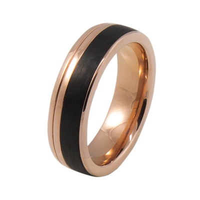 Edelstahlring aus poliertem chirurgischem Edelstahl 316L Rose vergoldet mit schwarzer Carbon Einlage. Innen ist der Ring für einen besseren Tragekomfort bombiert.
