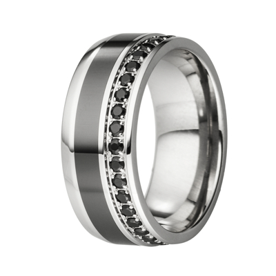 Hochwertiger Edelstahlring aus poliertem chirurgischem Edelstahl 316L mit schwarzer, polierter Keramikeinlage. Innen ist der Ring für einen besseren Tragekomfort bombiert. Umlaufend mit schwarzen Zirkonias besetzt.