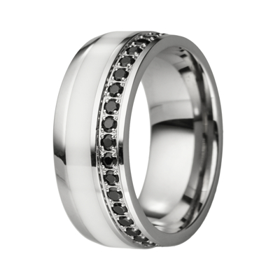 Hochwertiger Edelstahlring aus poliertem chirurgischem Edelstahl 316L mit weißer, polierter Keramikeinlage. Innen ist der Ring für einen besseren Tragekomfort bombiert. Umlaufend mit schwarzen Zirkonias besetzt.
