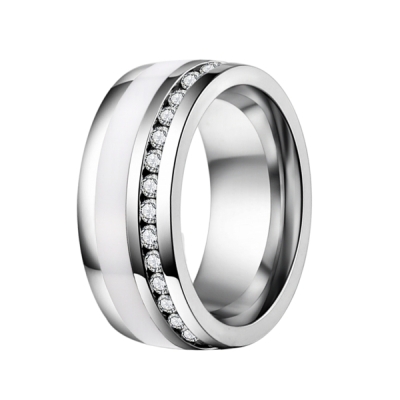 Hochwertiger Edelstahlring aus poliertem chirurgischem Edelstahl 316L mit weißer, polierter Keramikeinlage. Innen ist der Ring für einen besseren Tragekomfort bombiert. Umlaufend mit schwarzen Zirkonias besetzt.