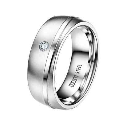 Hochwertiger, aus Edelstahl gefertigter, Freundschaftsring / Partnerring. Die Oberfläche ist mattiert,der schräglaufende Längsstreifen poliert, besetzt mit einem Zirkonia. Innen ist der Ring für einen besseren Tragekomfort bombiert.