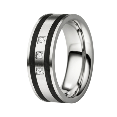 Hochwertiger, aus Edelstahl gefertigter, Freundschaftsring / Partnerring. Die Oberfläche ist gebürstet und mit zwei schwarzen Längsstreifen versehen, besetzt mit drei Zirkonia. Innen ist der Ring für einen besseren Tragekomfort bombiert.