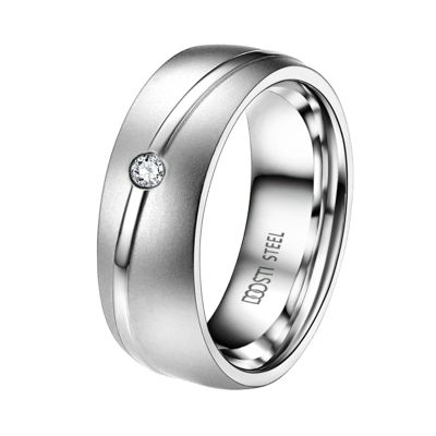 Hochwertiger, aus Edelstahl gefertigter, Freundschaftsring / Partnerring. Die Oberfläche ist mattiert,der schräglaufende Längsstreifen poliert, besetzt mit einem Zirkonia. Innen ist der Ring für einen besseren Tragekomfort bombiert.