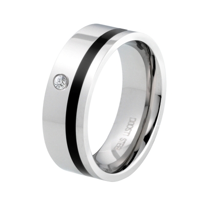 Hochwertiger, aus Edelstahl gefertigter, Freundschaftsring / Partnerring. Die Oberfläche ist längs gebürstet, mit schwarzer Kunstoffeinlage, besetzt mit einem Zirkonia. Innen ist der Ring für einen besseren Tragekomfort bombiert.