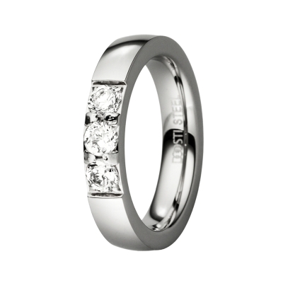 Hochwertiger, aus Edelstahl gefertigter, Freundschaftsring / Partnerring. Die Oberfläche ist poliert, besetzt mit drei Zirkonia. Innen ist der Ring für einen besseren Tragekomfort bombiert.