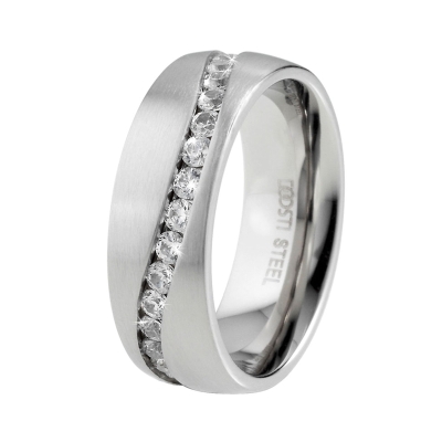 Hochwertiger, aus Edelstahl gefertigter, Freundschaftsring / Partnerring. Die Oberfläche ist gebürstet, umlaufend Zirkonia. Innen ist der Ring für einen besseren Tragekomfort bombiert.