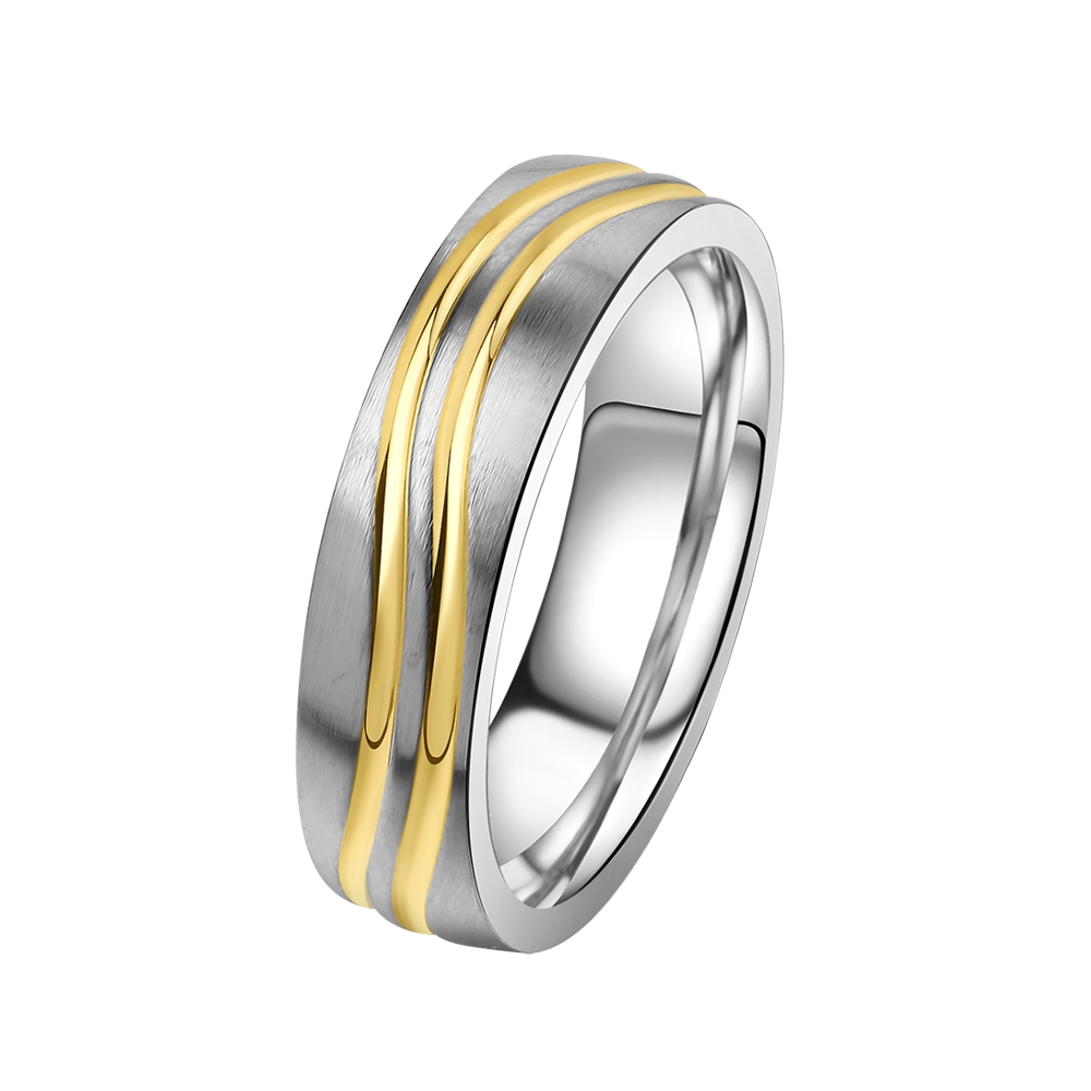 Hochwertiger, aus Edelstahl gefertigter, Freundschaftsring / Partnerring. Die Oberfläche ist gebürstet. Die Fugen sind Gelgold beschichtet (poliert). Innen ist der Ring für einen besseren Tragekomfort bombiert.