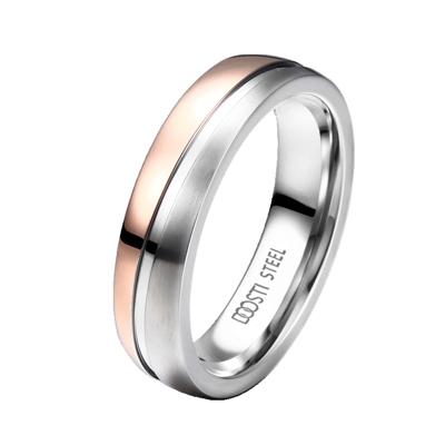 Hochwertiger, aus Edelstahl gefertigter, Freundschaftsring / Partnerring. Die Oberfläche ist Rosegold beschichtet (poliert) und längs gebürstet, schräglaufende polierte Fuge. Innen ist der Ring für einen besseren Tragekomfort bombiert.