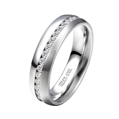 Hochwertiger, aus Edelstahl gefertigter, Freundschaftsring / Partnerring. Die Oberfläche ist poliert und längs gebürstet, schräg umlaufend Zirkonia. Innen ist der Ring für einen besseren Tragekomfort bombiert.