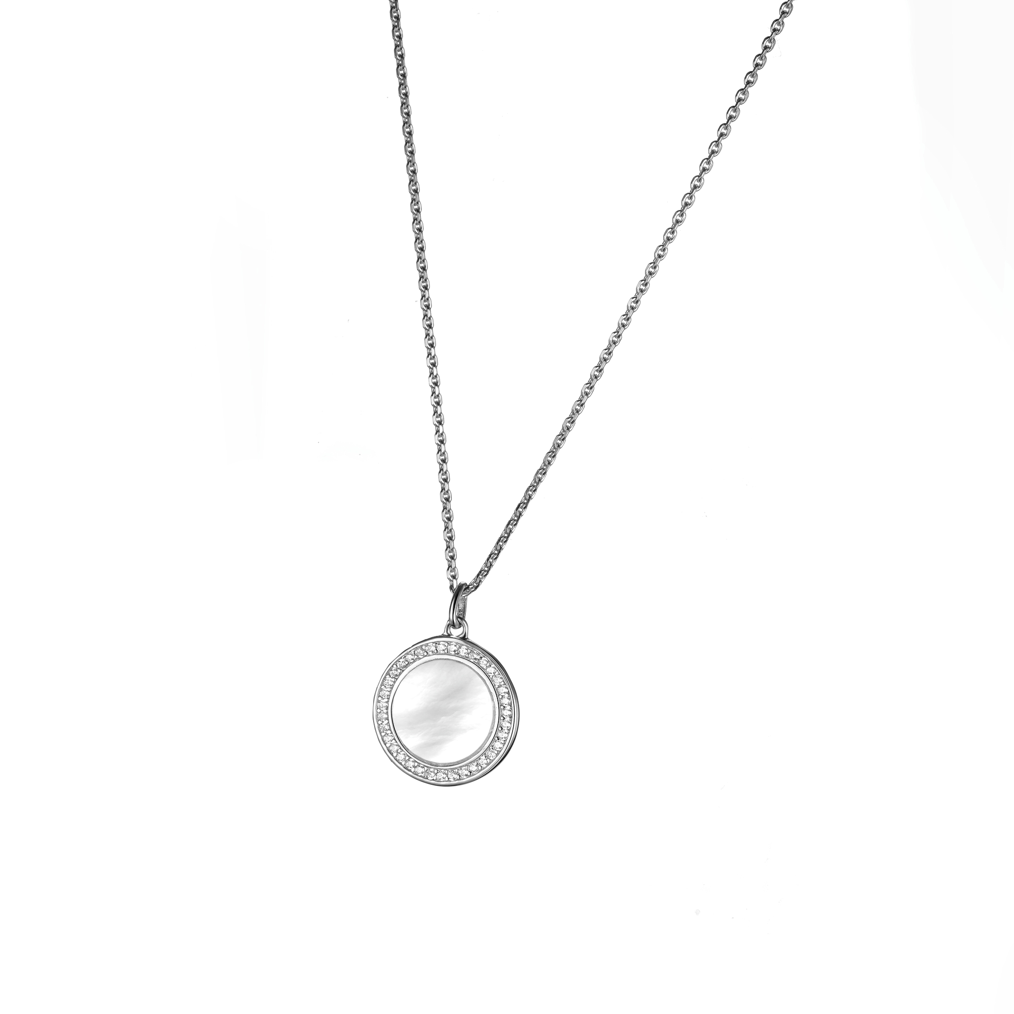 Durchmesser des Anhängers ca. 15mm, mit mehreren Zirkonia besetzt, Perlmutt Einlage in der Mitte